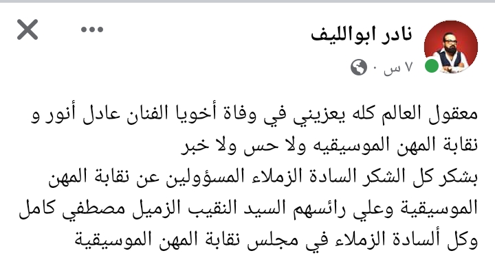 وكتب نادر أبو الليف منشورًا على حسابه الرسمي بـ فيس بوك، معلقًا: معقول العالم كله يعزيني في وفاة أخويا الفنان عادل أنور ونقابة المهن الموسيقية ولا حس ولا خبر.