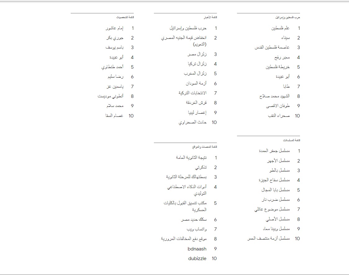 كشفت مؤشرات جوجل عن أبرز الأخبار التي بحث عنها المصريون في عام 2023، العام الذي يعد ملئ بالأحداث المختلفة، فمنها ما هو دولي خارج مصر، ومنها ما هو محلي، حيث كشفت مؤشرات بحث المصريين وفقا لجوجل أن الحرب على غزة هي الأكثر بحثا من المصريين خلال العام 2023، يأتي ذلك على الرغم من بدء الحرب يوم السابع من أكتوبر 2023 وتستمر حتى الآن.