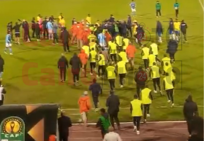 وفي نهاية مباراة بيراميدز وصن داونز، أظهرت الكاميرات مناوشات بين لاعبي الفريقين، وسط التفاف أمني حول لاعبي الفريق الجنوب إفريقي وحكم المباراة، منعًا لتعرضهم لأي اعتداء.