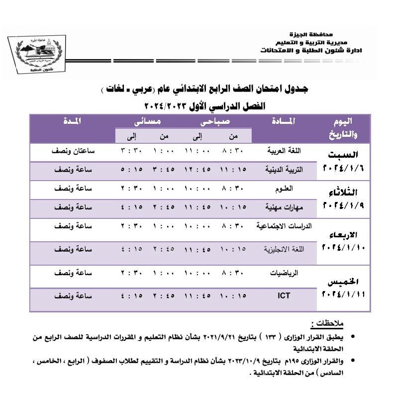 جدول امتحانات الصف الرابع الابتدائي الترم الأول 2024