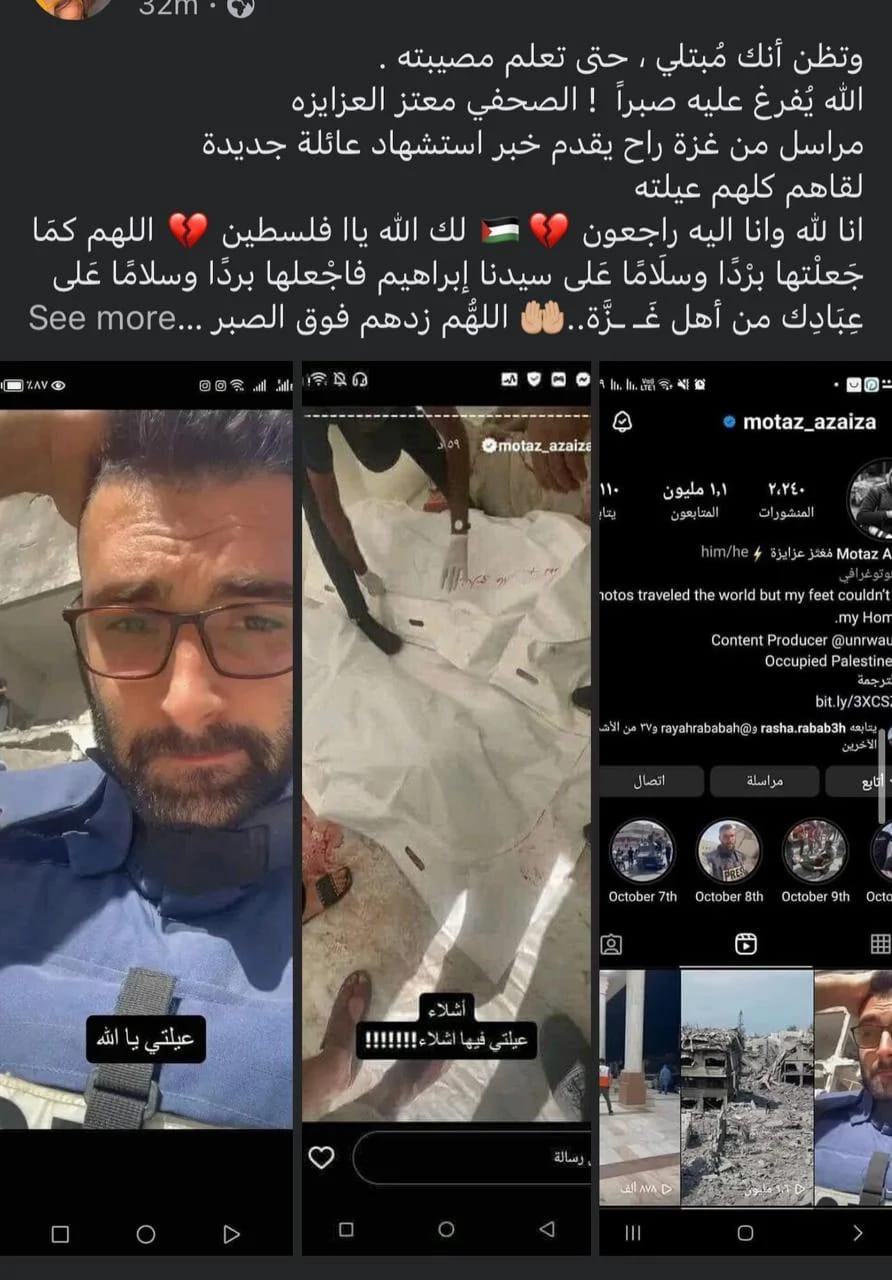 تصدر الصحفي الفلسطيني معتز عزايزة الترند على مواقع التواصل الاجتماعي بسبب تغطيته المستمرة لأحداث الحرب الإسرائيلية على قطاع غزة، ولكن كانت البداية الأساسية التي أثارت تعاطف مستخدمي وسائل التواصل الاجتماعي، عندما توجه لتغطية القصف فوجد عائلته أشلاء تحت الأنقاض.