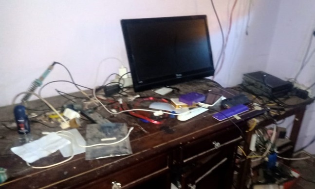 وبالتفتيش في حضوره، تم العثور على 25 قطعة لمكونات الشبكة عبارة عن أجهزة ومعدات ومستلزمات لاستقبال الإشارة ومعالجتها وإعادة بثها بصورة لاسلكية و2 محطة بث لاسلكي لتوسيع دائرة البث للشبكة وهاتف محمول يستخدم في إدارة الشبكة.
