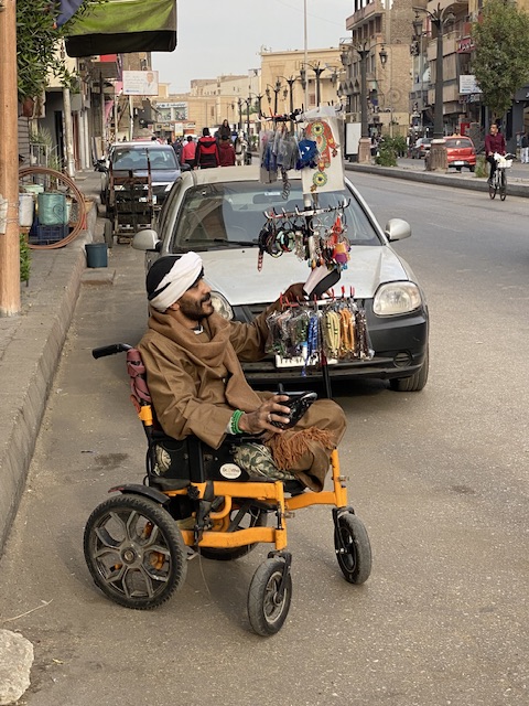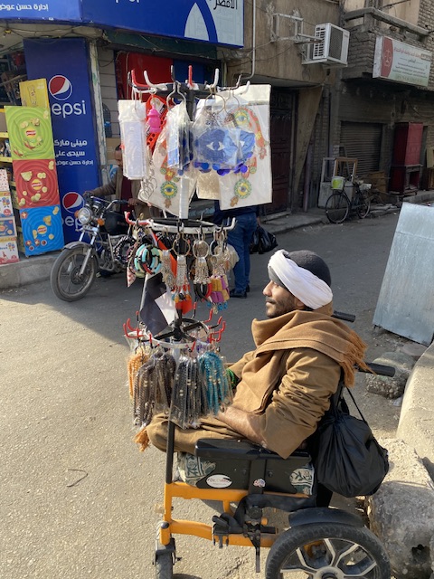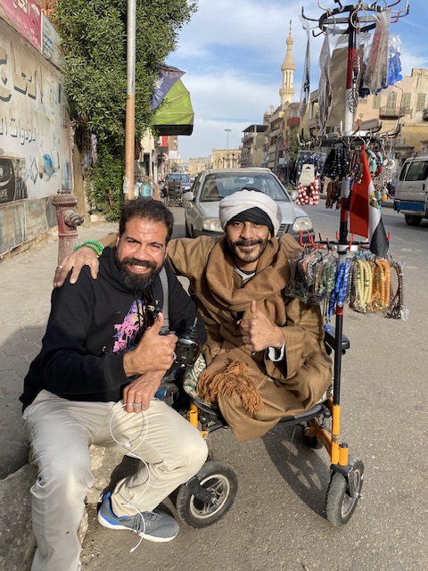 يتجول بكرسيه المتحرك بوجه باسم بشوارع مدينة الأقصر واضعا مجموعة من السبح والميداليات على فاترينة صنعها متصلة بمقعدة ليعلق عليها بضاعتة تلك مناديا عليها بقولة مدد يارب.