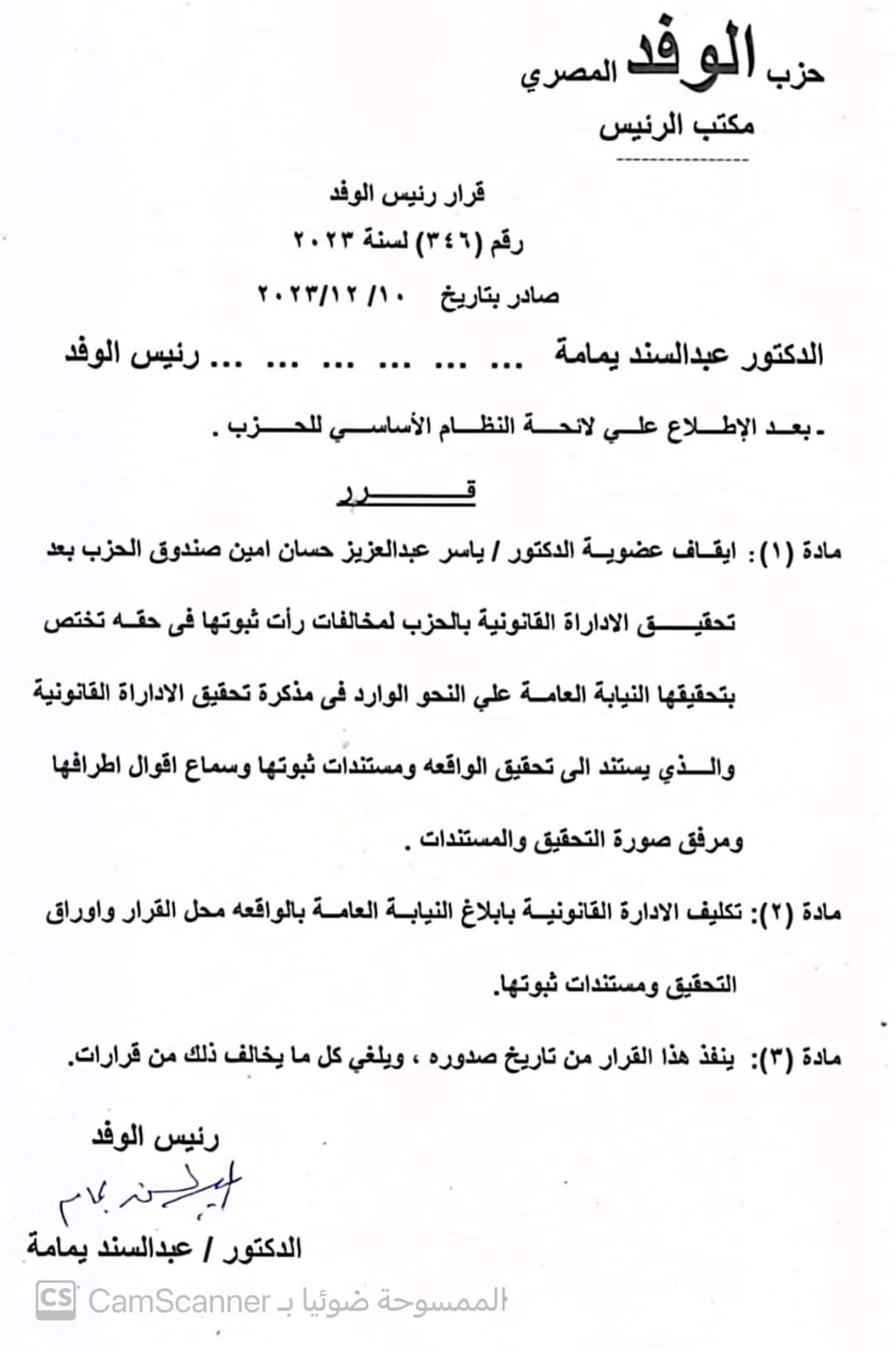 وقبل انطلاق الانتخابات الرئاسية بقرابة 20 يوما أصدر الدكتور عبد السند يمامة، رئيس حزب الوفد قرارات فصل رآها أعضاء بالحزب أنها تعسفية لعدد من أعضاء وقيادات الحزب، ومنعهم من دخول الحزب، وشملت القرارات الفصل أمين الصندوق الدكتور ياسر حسان، الذي صدر قرار فصله منذ فترة وأظهره يمامة مؤخرا.
