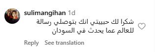 وكتبت متابعة أخرى تعليقا لـ منة الزهيري على الفيديو من حساب باسم هديل السعدي: شكرا ليكي على الشرح.. والله شيء محزن..لاحول ولا قوة الا بالله، ومتابعة أخرى من حساب باسم جيهان سليمان قائلة: شكرا لك حبيبتي انك بتوصلي رسالة للعالم عن ما يحدث في السودان.
