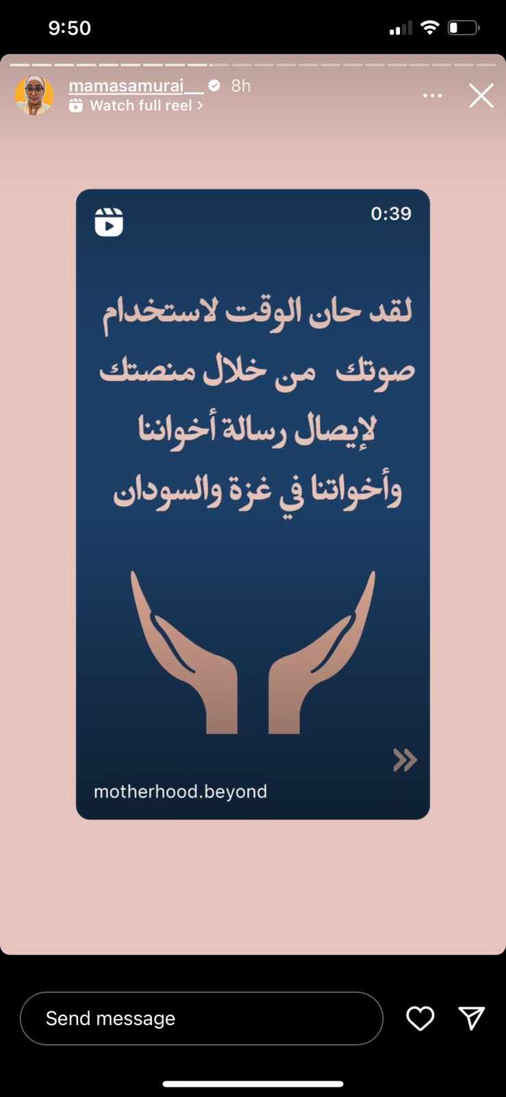 والبلوجر سارة نيشيهيرا عبرت أيضًا عن تضامنها مع السودان، وأكدت على أهمية التوعية بالقضية السودانية قائلة: حان الوقت لاستخدام صوتك من خلال منصتك لإيصال رسالة أخواننا في غزة والسودان.