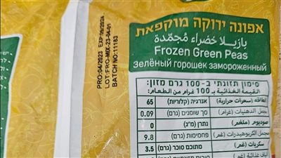 وأظهرت البيانات أن أكياس البسلة المتداول عليها باللغة العبرية من إنتاج شركة راية فودز بالمنطقة الصناعية الأولى بمدينة السادات محافظة المنوفية، والمستورد هو شركة فروزن فيلد م. ض جادة بن جوريون 57 حيفا، وتظهر البيانات أن تاريخ الإنتاج هو شهر أبريل 2023، ومدة الصلاحية حتى عام 2024.