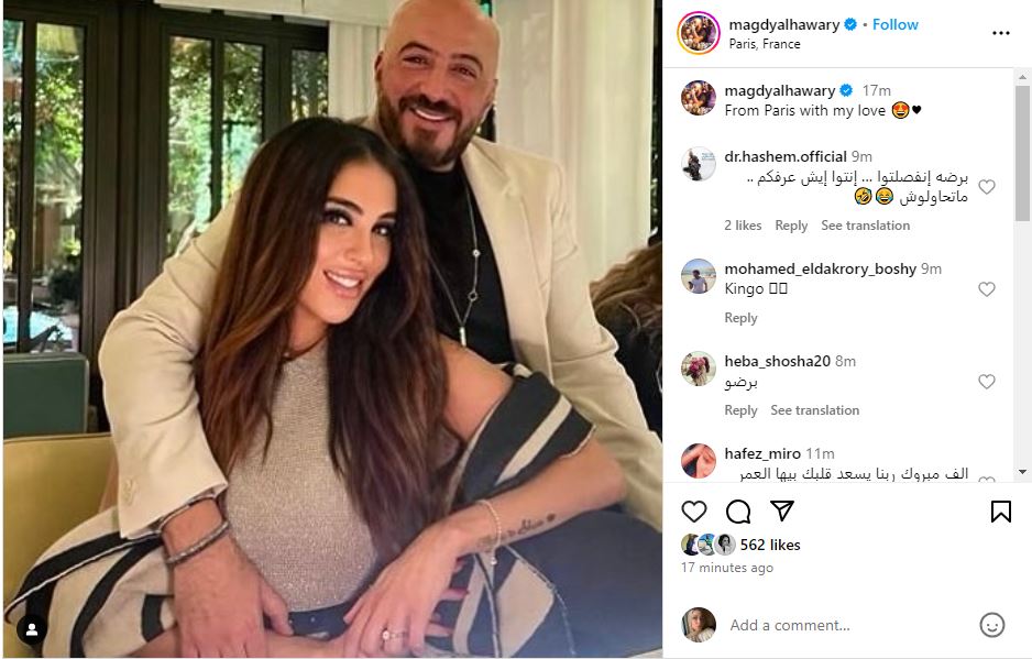 ونشر مجدي الهواري صورة تجمعه بزوجته دنيا عبد المعبود، وهما في فرنسا، وذلك عبر حسابه الرسمي بموقع انستجرام، وعلق قائلًا: من باريس مع حبي.