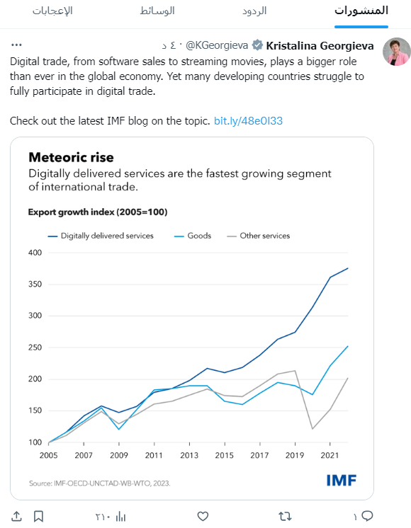 قالت كريستالينا جورغييفا مديرة صندوق النقد الدولي إن التجارة الرقمية من مبيعات البرمجيات إلى الأفلام تلعب دورا أكبر من أي وقت مضى في الاقتصاد العالمي، ومع ذلك فإن العديد من البلدان النامية تكافح من أجل المشاركة الكاملة في التجارة الرقمية.