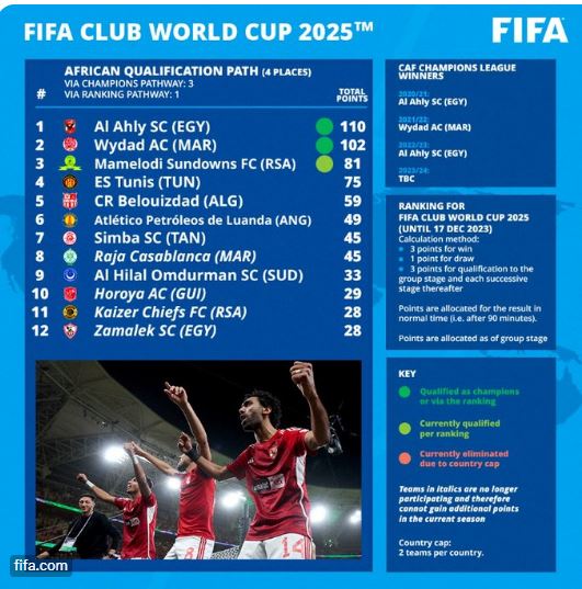 أزاح الاتحاد الدولي لكرة القدم فيفا الستار عن تصنيف الأندية الإفريقية، والذي تم في ضوئه تحديد أسماء الأندية المرشحة للمشاركة في بطولة كأس العالم للأندية 2025 بنظامها الجديد والتي ستقام بمشاركة 32 فريقًا.