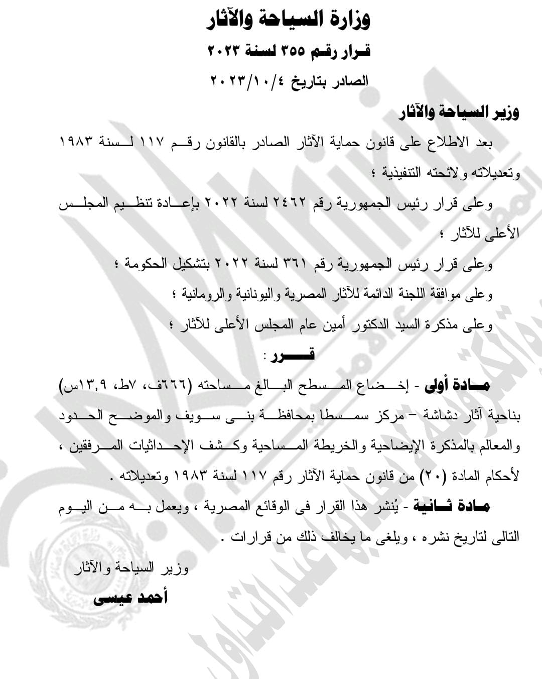 بعد الاطلاع على قانون حماية الآثار الصادر بالقانون رقم 117 لسنة 1983 وتعديلاته ولائحته التنفيذية ؛ وعلى قرار رئيس الجمهورية رقم 2462 لسنة 2022 بإعادة تنظيم المجلس الأعلى للآثار؛ وعلى قرار رئيس الجمهورية رقم 361 لسنة 2022 بتشكيل الحكومة؛ وعلى موافقة اللجنة الدائمة للآثار المصرية واليونانية والرومانية.
