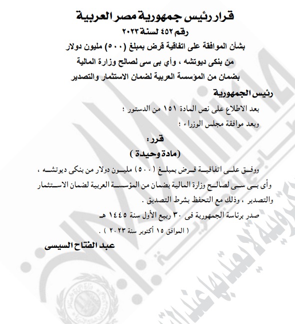 نشرت الجريدة الرسمية في عددها الصادر اليوم الخميس، قرار رئيس الجمهورية رقم 452 لسنة 2023، بشأن الموافقة على اتفاقية قرض بمبلغ 500 مليون دولار من بنكي ديوتشه، وأي بي سي لصالح وزارة المالية بضمان من المؤسسة العربية لضمان الاستثمار والتصدير.
