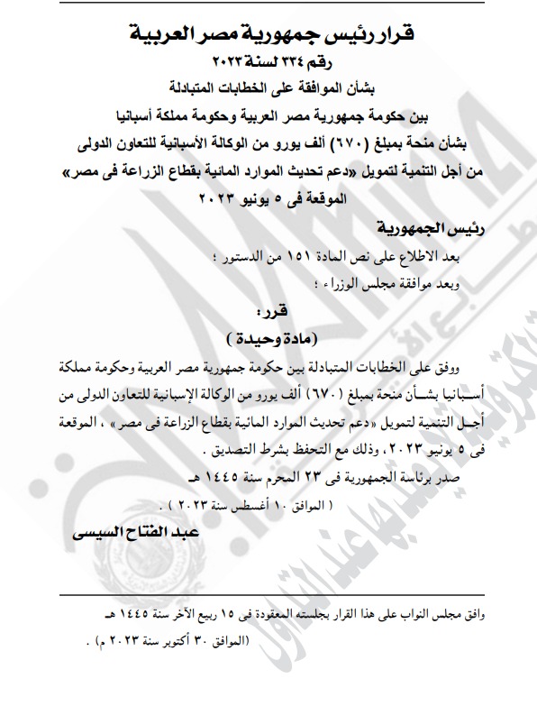 كما نشرت الجريدة قرار رئيس الجمهورية رقم 334 لسنة 2023، بشأن منحة بمبلغ 670 ألف يورو من الوكالة الأسبانية للتعاون الدولي من أجل التنمية لتمويل دعم تحديث الموارد المائية بقطاع الزراعة في مصر.