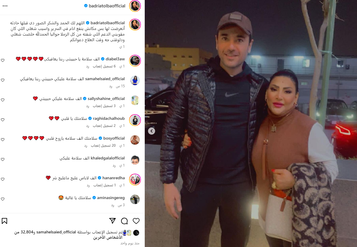 طمأنت الفنانة بدرية طلبة جمهورها على حالتها الصحية، بعد نجاتها من حادث سير، حيث نشرت صورة لها رفقة الفنان أحمد عز، عبر حسابها الشخصي بموقع تبادل الصور والفيديوهات القصيرة انستجرام، حيث قالت: اللهم لك الحمد والشكر، الصور دي قبلها حادثة أتعرضت لها، بس مكانش ينفع أنام في السرير، وأسيب شغلي اللي كان مقويني الدعم، اللي شفته من كل الزملا حواليا، الحمد لله خلصت شغلي ودلوقتي جيه وقت العلاج دعواتكم.