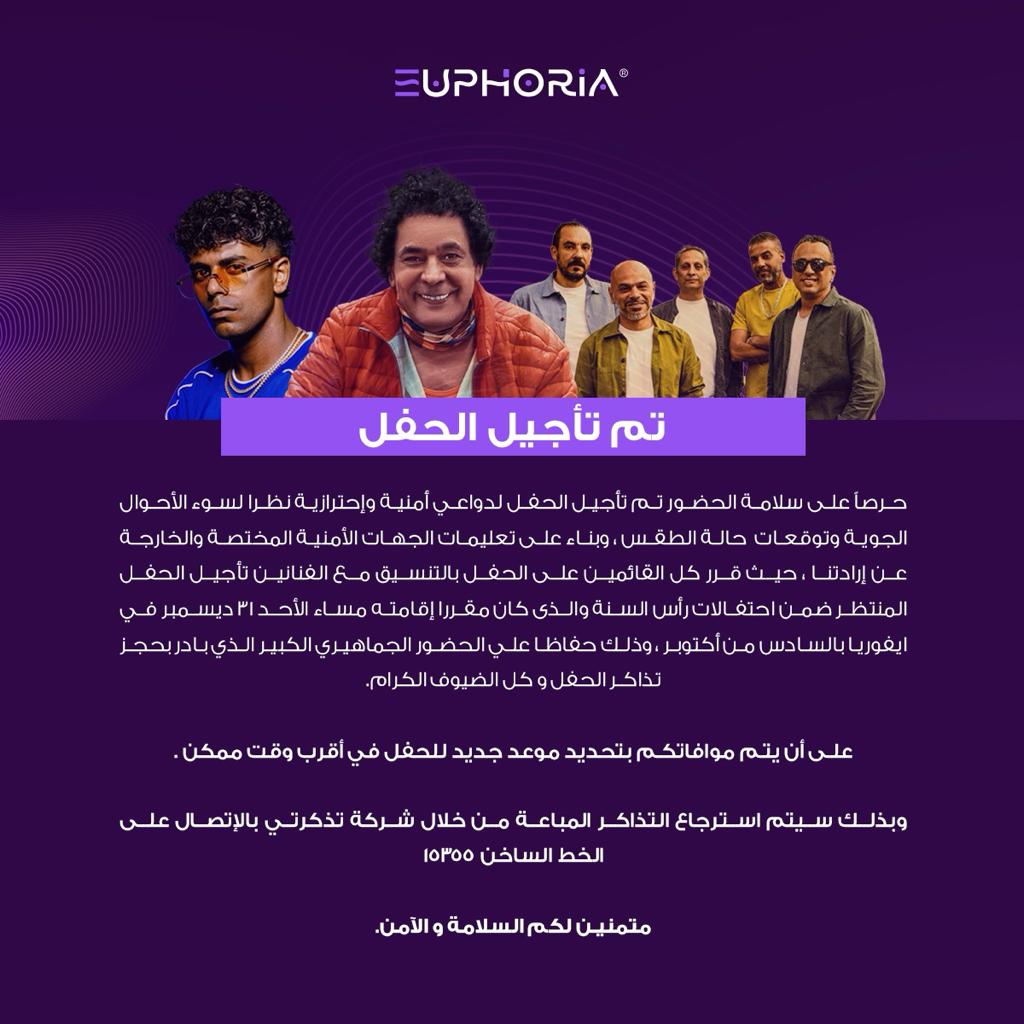 وكشف منظمو الحفل في بيان رسمي، عن تأجيل موعد الحفل المنتظر الذي يجمع بين محمد منير ومسار إجباري وعفروتو لأول مرة كإحدى أضخم حفلات رأس السنة بمصر، في افتتاح مسرح وممشى ايفوريا في الشيخ زايد، وذلك إلى موعد آخر سيتم إعلانه رسميا خلال أيام.