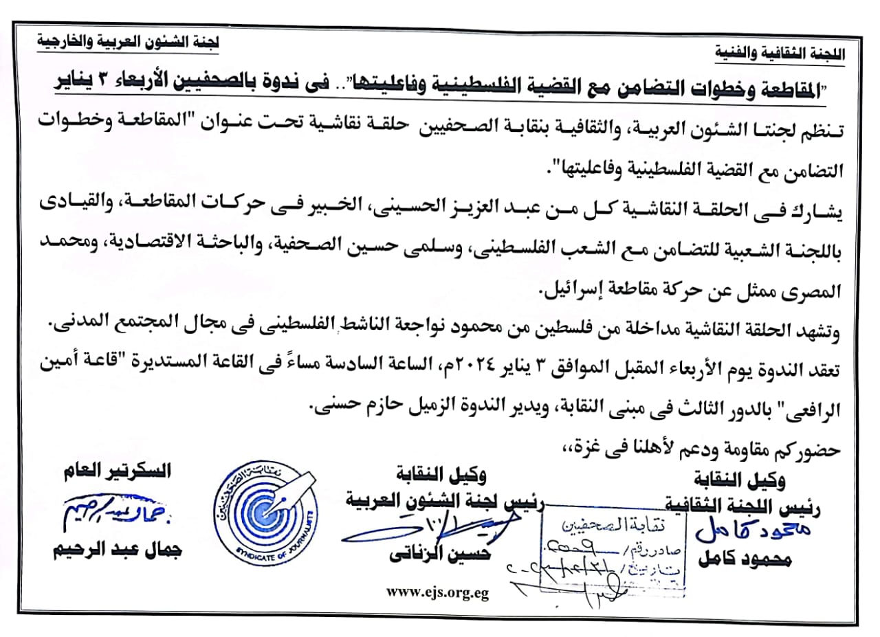 تنظم لجنتا الشئون العربية والثقافية بنقابة الصحفيين حلقة نقاشية تحت عنوان المقاطعة وخطوات التضامن مع القضية الفلسطينية وفاعليتها، وذلك ضمن ندوة في نقابة الصحفيين الأربعاء 3 يناير.