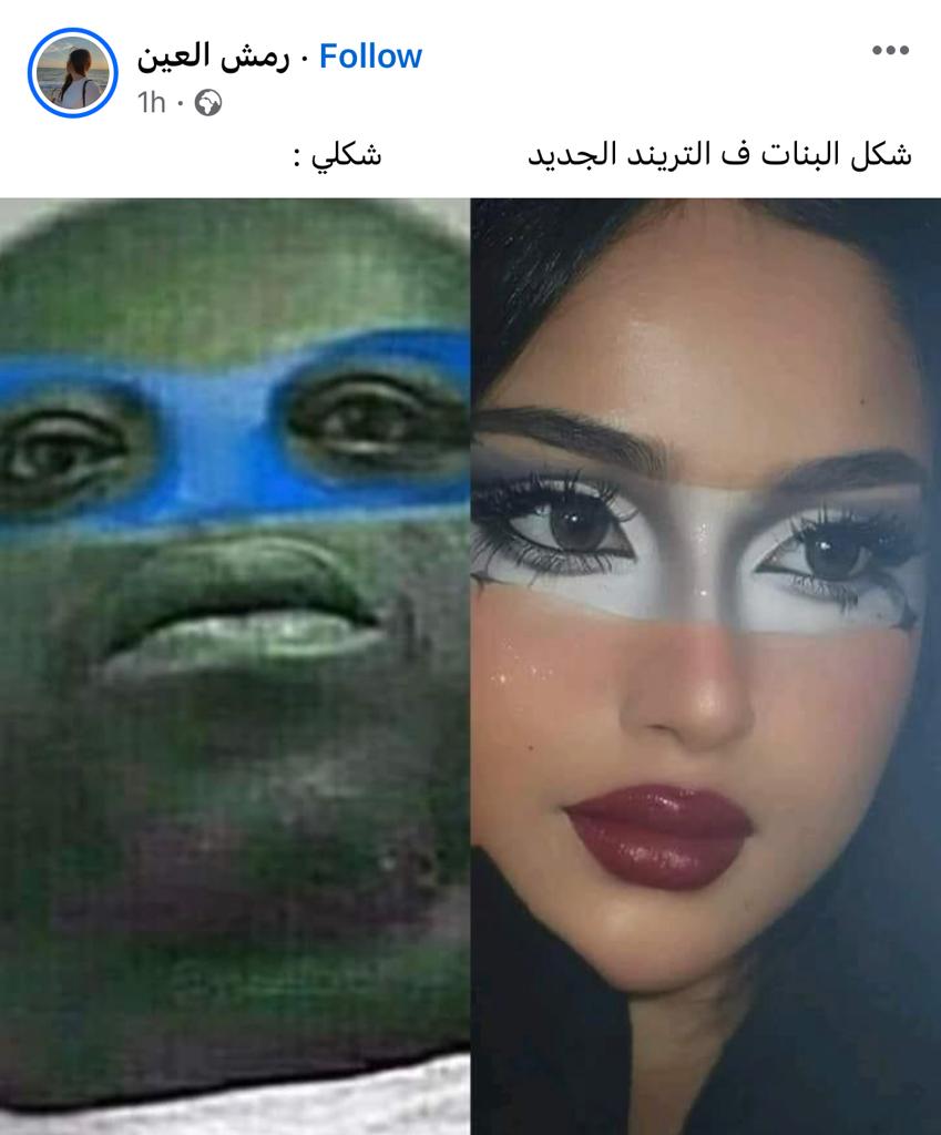 واستقبل مستخدمو السوشيال ميديا، هذا الترند الجديد بكثير من التعليقات الساخرة، التي شبهت بين فتيات هذا المكياج، وكارتون سلاحف النينجا الشهير، الذي اشتهر بعيونه المحددة أقمطة القماش الملونة.