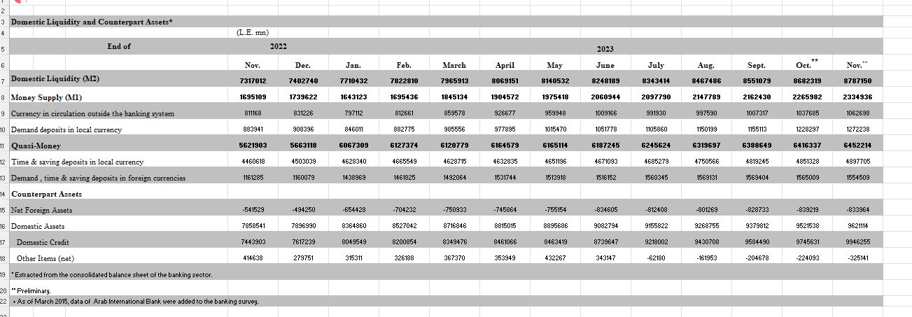 وأوضح أن الودائع تحت الطلب بالعملة المحلية بلغت 1.272 تريليون جنيه بنهاية نوفمبر 2023، مقابل 908.3 مليار جنيه بنهاية ديسمبر 2022، فيما سجلت أشباه النقود 6.452 تريليون جنيه.