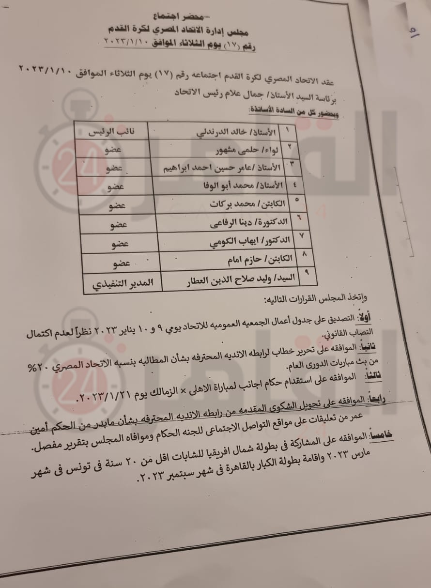 وحصل القاهرة 24 على نسخة من جدول أعمال اجتماع الجمعية العمومية العادية لـ اتحاد الكرة، والذي تضمن عدة بنود جاء في مقدمتها التصديق على محضر الاجتماع السابق، والنظر في تقرير مجلس إدارة اتحاد الكرة عن العام المالي المنقضي، وتقرير النشاط.