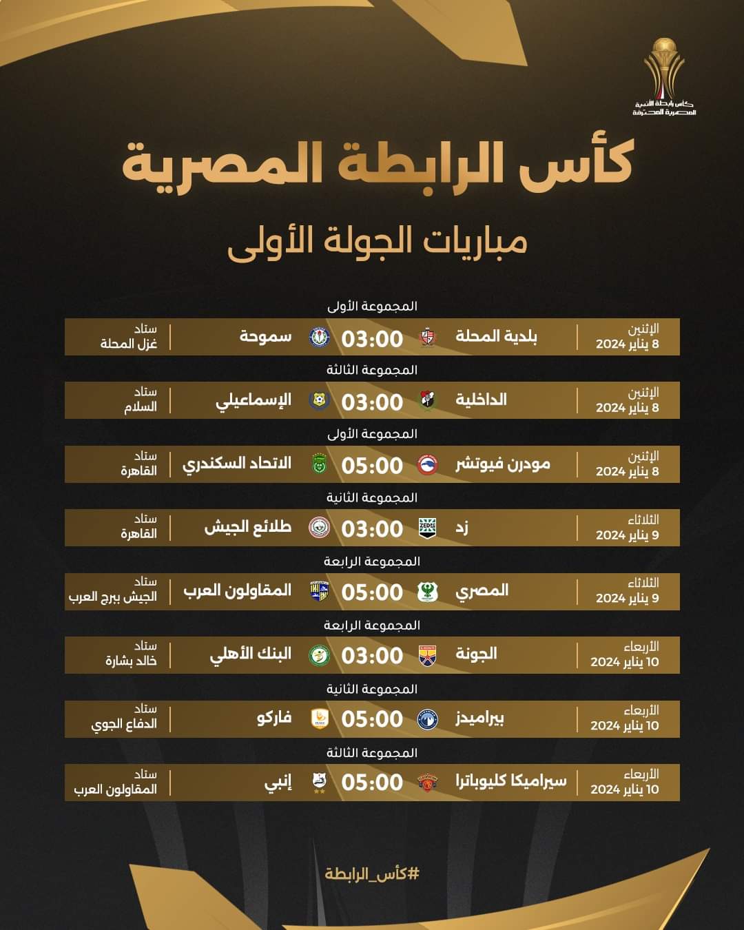 أعلنت رابطة الأندية المحترفة ولجنة المسابقات عن أول 3 جولات من دور المجموعات لبطولة كأس الرابطة للموسم الجديد والتي تنطلق يوم 7 يناير، خلال فترة كأس الأمم الإفريقية والمقرر لها في كوت ديفوار.
