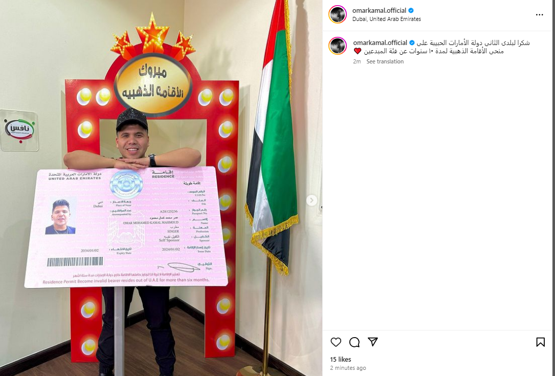 عمر كمال يعلن حصوله على الإقامة الذهبية في الإمارات عن فئة المبدعين