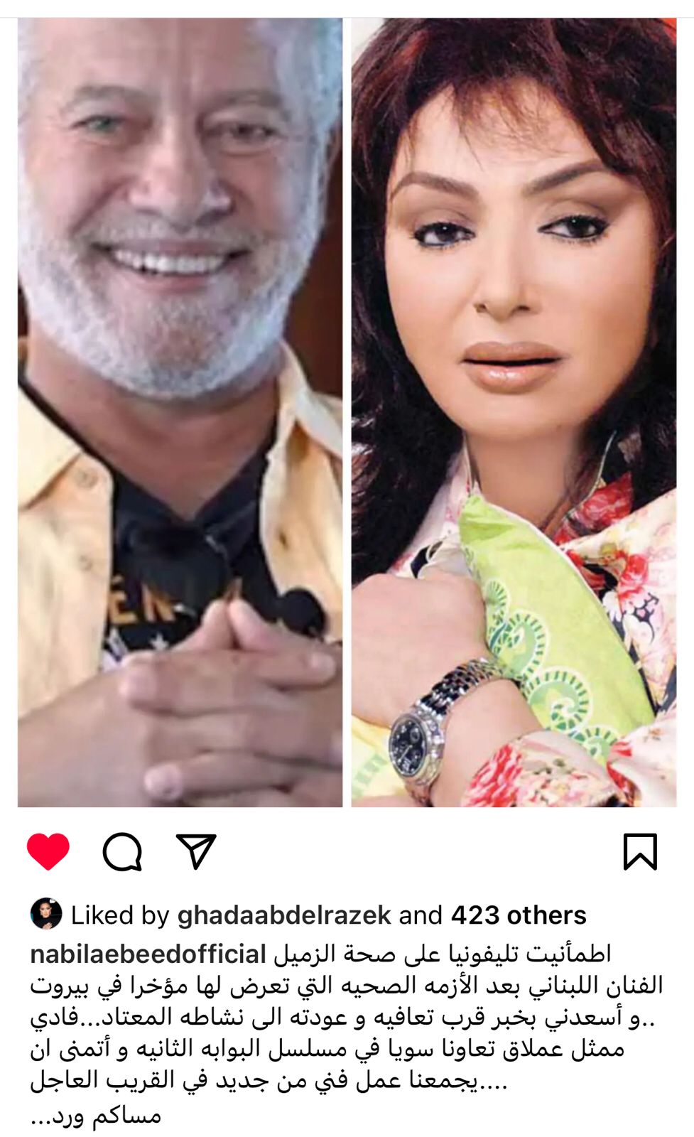 وكتبت نبيلة عبيد، منشورًا عبر حسابها الشخصي بموقع تبادل الصور والفيديوهات انستجرام، وعلقت قائلة: اطمأنيت تليفونيًا على صحة الزميل الفنان اللبناني بعد الأزمة الصحية التي تعرض لها مؤخرا في بيروت.. وأسعدني بخبر قرب تعافيه وعودته إلى نشاطه المعتاد.