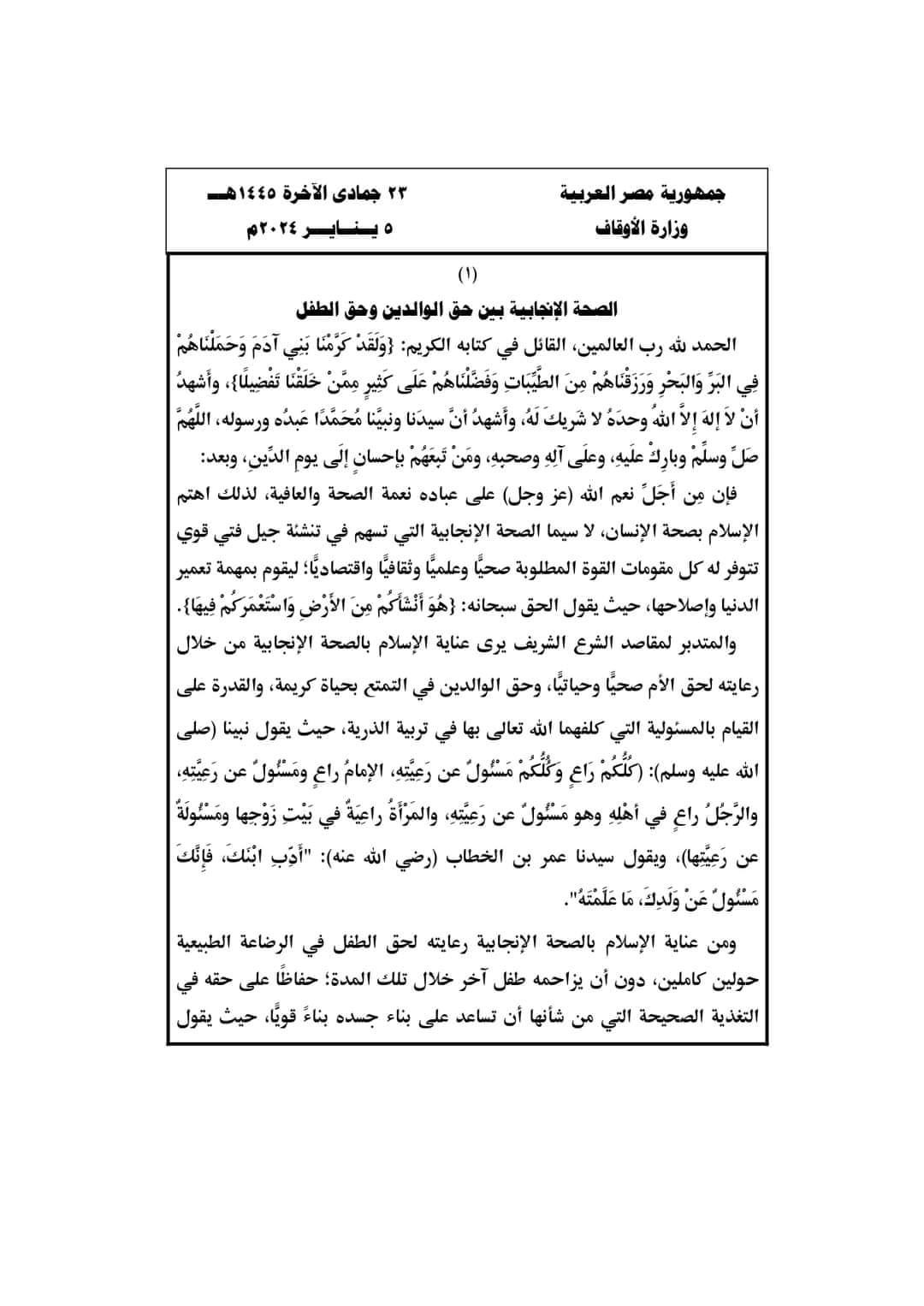 حددت وزارة الأوقاف عنوان الصحة الإنجابية بين حق الوالدين وحق الطفل، موضوعًا لخطبة الجمعة اليوم 5 يناير 2024، في جميع مساجد مصر.