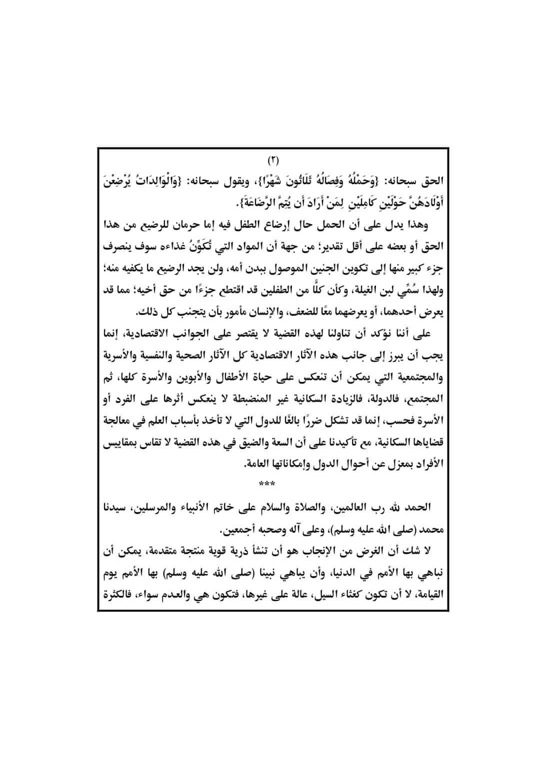ومن عناية الإسلام بالصحة الإنجابية رعايته لحق الطفل في الرضاعة الطبيعية حولين كاملين، دون أن يزاحمه طفل آخر خلال تلك المدة؛ حفاظًا على حقه في التغذية الصحيحة التي من شأنها أن تساعد على بناء جسده بناء قويا، حيث يقول الحق سبحانه: {وَحَمْلُهُ وَفِصَالُهُ ثَلَاثُونَ شَهْرًا، ويقول سبحانه: {وَالْوَالِدَاتُ يُرْضِعْنَ أَوْلَادَهُنَّ حَوْلَيْنِ كَامِلَيْنِ لِمَنْ أَرَادَ أَن يُتِمَّ الرَّضَاعَةَ}. وهذا يدل على أن الحمل حال إرضاع الطفل فيه إما حرمان للرضيع من هذا الحق أو بعضه على أقل تقدير؛ من جهة أن المواد التي تُكَوِّن غذاءه سوف ينصرف جزء كبير منها إلى تكوين الجنين الموصول ببدن أمه، ولن يجد الرضيع ما يكفيه منه؛ ولهذا سمي لبن الغيلة، وكأن كلا من الطفلين قد اقتطع جزءا من حق أخيه؛ مما قد يعرض أحدهما، أو يعرضهما معًا للضعف والإنسان مأمور بأن يتجنب كل ذلك. على أننا نؤكد أن تناولنا لهذه القضية لا يقتصر على الجوانب الاقتصادية، إنما يجب أن يبرز إلى جانب هذه الآثار الاقتصادية كل الآثار الصحية والنفسية والأسرية والمجتمعية التي يمكن أن تنعكس على حياة الأطفال والأبوين والأسرة كلها، ثم المجتمع، فالدولة فالزيادة السكانية غير المنضبطة لا ينعكس أثرها على الفرد أو الأسرة فحسب، إنما قد تشكل ضررا بالغا للدول التي لا تأخذ بأسباب العلم في معالجة قضاياها السكانية، مع تأكيدنا على أن السعة والضيق في هذه القضية لا تقاس بمقاييس الأفراد بمعزل عن أحوال الدول وإمكاناتها العامة.