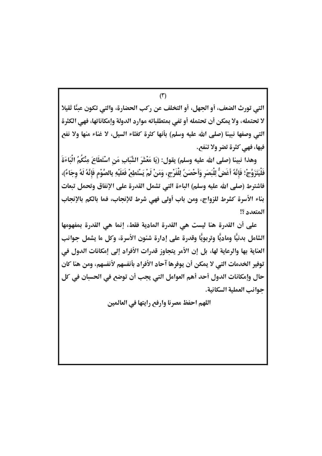 على أن القدرة هنا ليست هي القدرة المادية فقط، إنما هي القدرة بمفهومها الشامل بدنيا وماديا وتربويا وقدرة على إدارة شئون الأسرة، وكل ما يشمل جوانب العناية بها والرعاية لها، بل إن الأمر يتجاوز قدرات الأفراد إلى إمكانات الدول في توفير الخدمات التي لا يمكن أن يوفرها آحاد الأفراد بأنفسهم لأنفسهم، ومن هنا كان حال وإمكانات الدول أحد أهم العوامل التي يجب أن توضع في الحسبان في كالجوانب العملية السكانية.