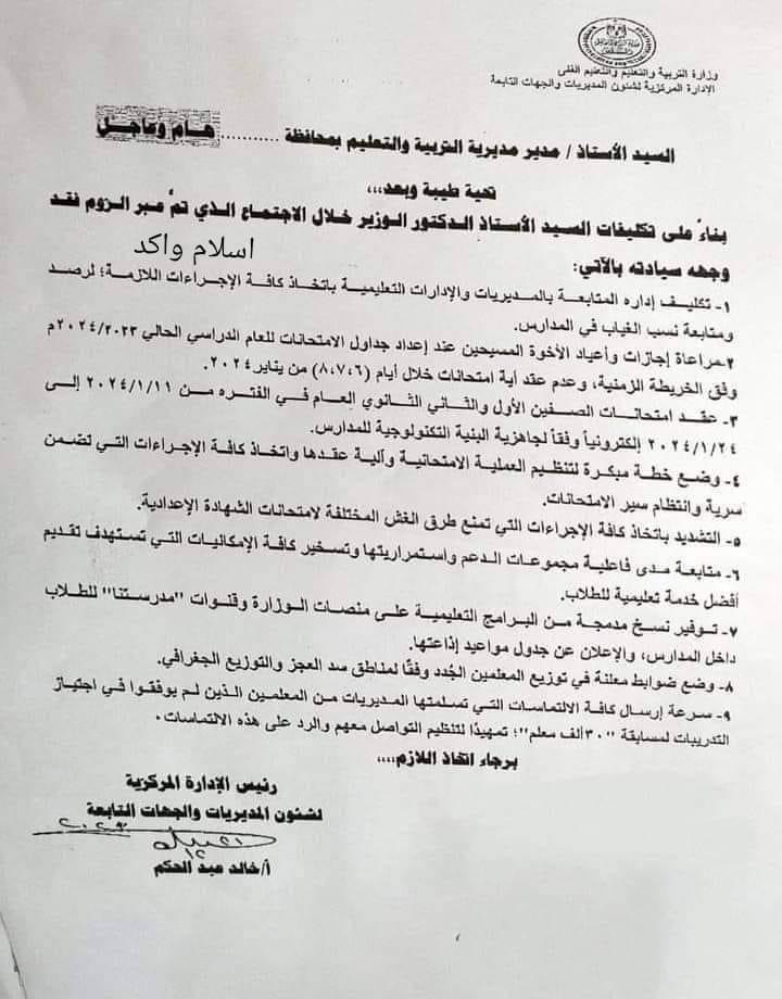 وشددت وزارة التربية والتعليم والتعليم الفني، على المديريات التابعة لها بجميع محافظات الجمهورية، بمنع عقد امتحانات بالتزامن مع إجازات أعياد الأخوة المسيحيين، ومراعاة هذا الأمر في وضع جداول الامتحانات.