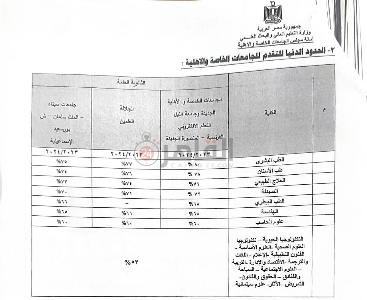 وفيما يلي ينشر القاهرة 24، الحد الأدنى للقبول بالجامعات الأهلية 2024 لقبول طلاب الثانوية العامة وطلاب الشهادات المعادلة، فيما يلي: