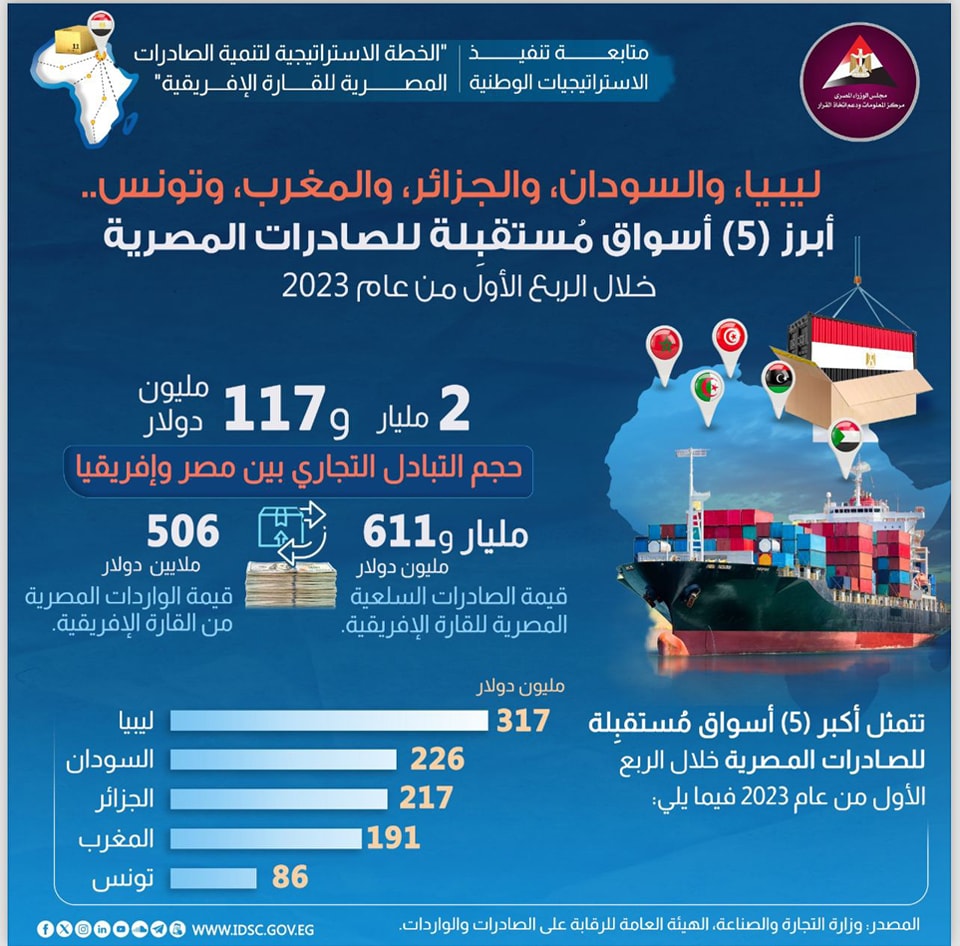 وأفاد المركز الإعلامي لمجلس الوزراء، أن ليبيا والسودان والجزائر والمغرب وتونس جاءت من أبرز 5 أسواق مستقبلة للصادرات المصرية خلال الربع الأول من عام 2023، مؤكدًا أن حجم التبادل التجاري بين مصر وإفريقيا وصل لـ 2 مليار و117 مليون دولار.