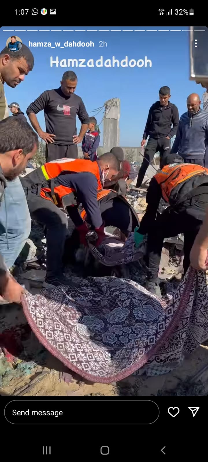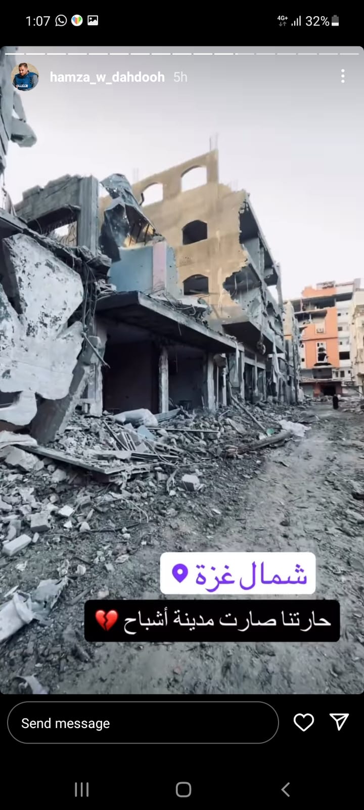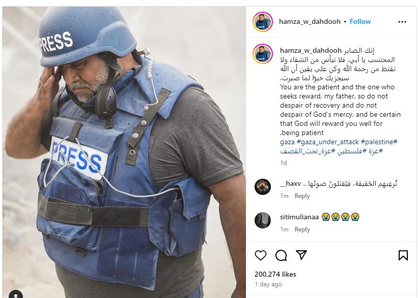 وكان المنشور الأخير الذي وضعه حمزة هو صورة لوالده وائل الدحدوح يدعوه فيها لعدم الاستسلام والبقاء صامدًا وقويًا، متعهدًا له بتعويض كبير من الله عز وجل على كل ما تحمله من فقد ومأساة ونكبة، وكل ما يتحمله من ألم جسدي نتيجة لاستهدافه برصاص الاحتلال من قبل، وألم نفسي نتيجة لفقدانه لزوجته وأحفاده في قصف إسرائيلي مؤخرًا.