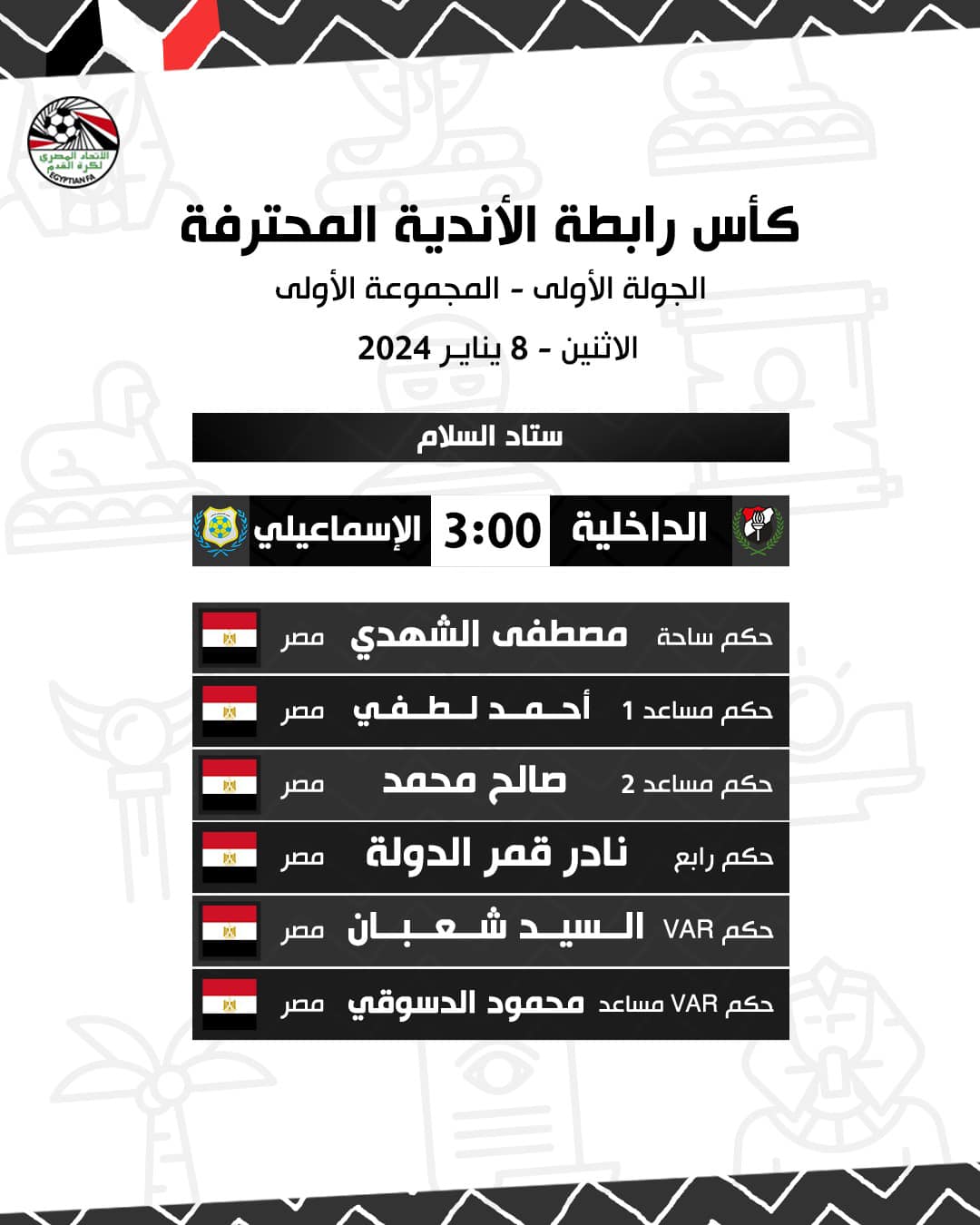 بينما يدير مباراة الداخلية والإسماعيلي طاقم حكام مكون من:-