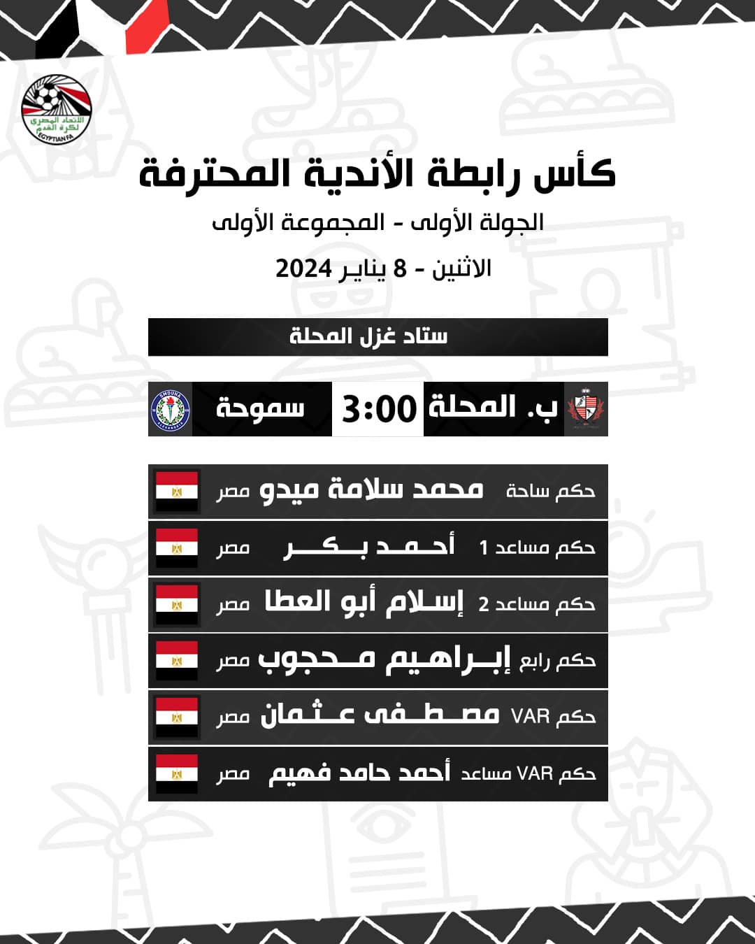 ويدير المباراة الأولى بين بلدية المحلة وسموحة طاقم حكام مكون من:-