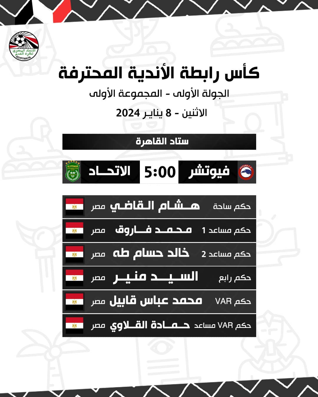 ويدير مباراة فيوتشر والاتحاد السكندري طاقم حكام مكون من:-
