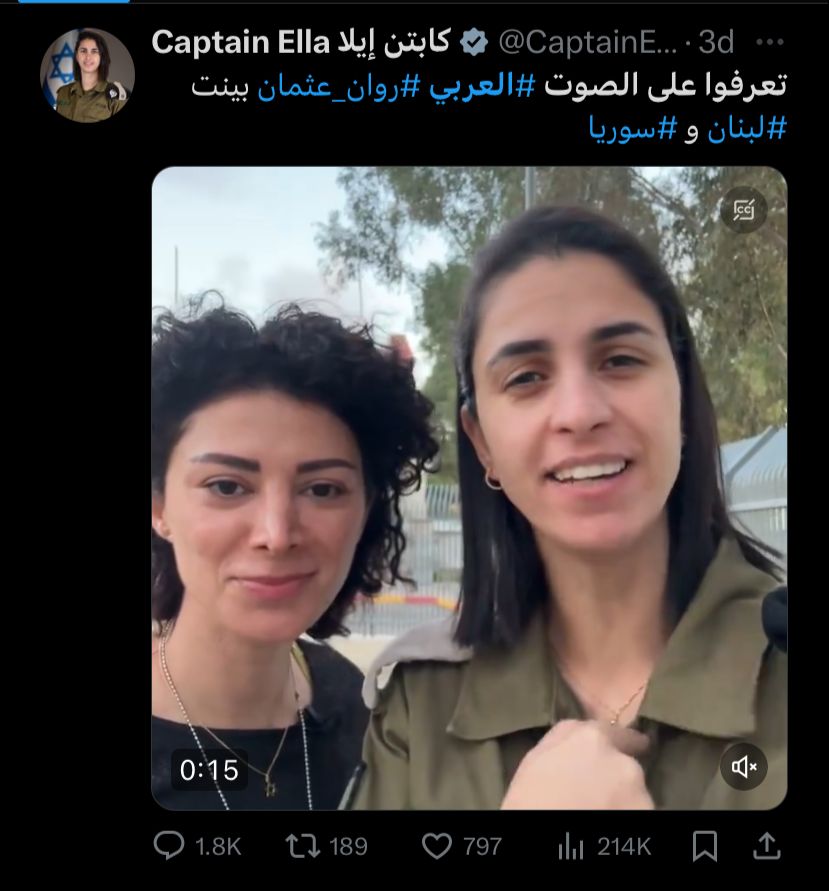 ونشرت كابتن إيلا، نائب الناطق باسم الجيش الاسرائيلي، مقطع فيديو عبر منصة اكس، وهي برفقة روان عثمان، قائلة: اليوم بعرفكم على امرأة لبنانية سورية من محبي السلام، تتضامن معنا نحن الإسرائيليين وحتى تقول بصوت عالٍ، لترد عليها روان عثمان قائلة: دواعش حماس لا يمثلونني.