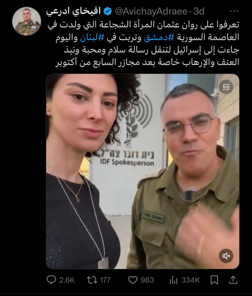 من هي روان عثمان التي ظهرت مع أفيخاي أدرعي المتحدث باسم الجيش الإسرائيلي؟