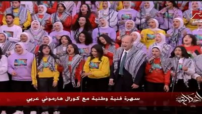 وشهدت حلقة برنامج الحكاية تقديم الإعلامي عمرو أديب، استضافة كورال هارموني عربي، للاحتفال ودعم الشعب الفلسطيني، وشارك عمرو أديب، خلال أداء الكورال، وارتدى الشال الفلسطيني تعبيرًا عن تضامنه منع الفلسطينيين.