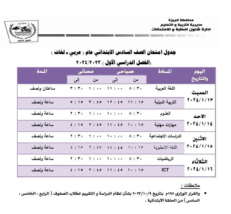 جدول امتحانات الصف السادس الابتدائي الترم الأول 2024 بالجيزة