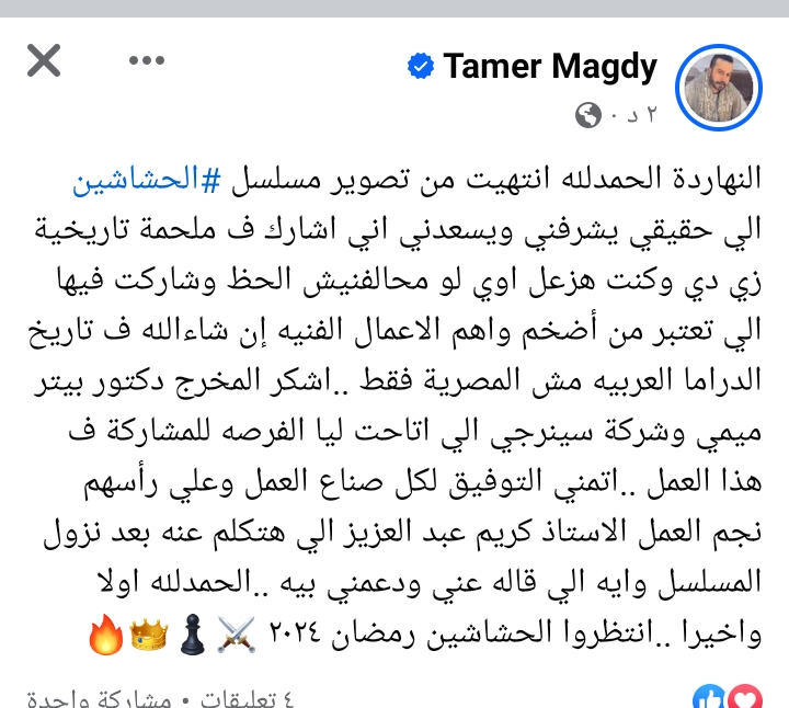 وكتب تامر مجدي، منشورًا عبر حسابه الشخصي بموقع فيسبوك، وقال: النهارده الحمد لله انتهيت من تصوير مسلسل الحشاشين.. اللي حقيقي يشرفني ويسعدني إني أشارك في ملحمة تاريخية زي دي، وكنت هزعل أوي لو محالفنيش الحظ.