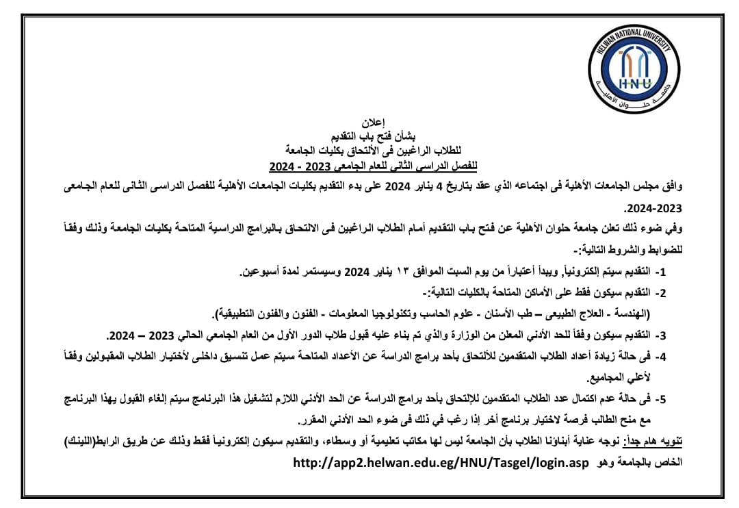 أعلنت جامعة حلوان الأهلية برئاسة الدكتور السيد قنديل، عن فتح باب التقديم أمام الطلاب الراغبين في الالتحاق بالبرامج الدراسية المتاحة في كليات الجامعة للفصل الدراسي الثاني من العام الجامعي 2023-2024، حيث وافق مجلس الجامعات الأهلية في اجتماعه الذي عقد بتاريخ 4 يناير 2024 على بدء التقديم في كليات الجامعات الأهلية للفصل الدراسي الثاني.