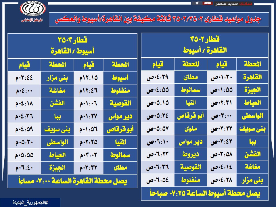 حيث تقرر اعتبارا من السبت المقبل تشغيل قطار 3502 القاهرة / أسيوط بتركيب 8 عربات ثالثة مكيفة يقوم من محطة القاهرة الساعة 01:30 صباحًا ويصل محطة أسيوط الساعة 07:25 صباحًا، وتشغيل قطار 3503 أسيوط / القاهرة يقوم من محطة أسيوط الساعة 12:15 ظهرًا ويصل محطة القاهرة الساعة 07:00 مساء بنفس التركيب الوارد به قطار 3502 لمحطة أسيوط طبقًا للجداول المرفقة.