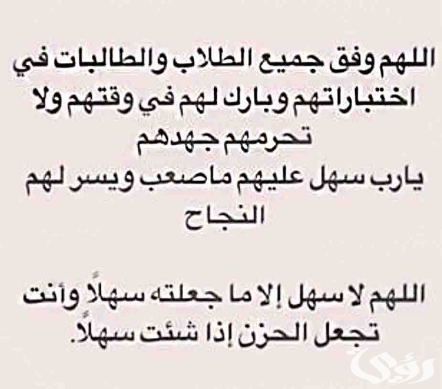 - اللّهُمّّ أسألك التيسير لهم، واجعل الامتحان يمر عليهم هينًا كشربة ماء وألهمهم الصواب وحسن الجواب، والرشد والرشاد.