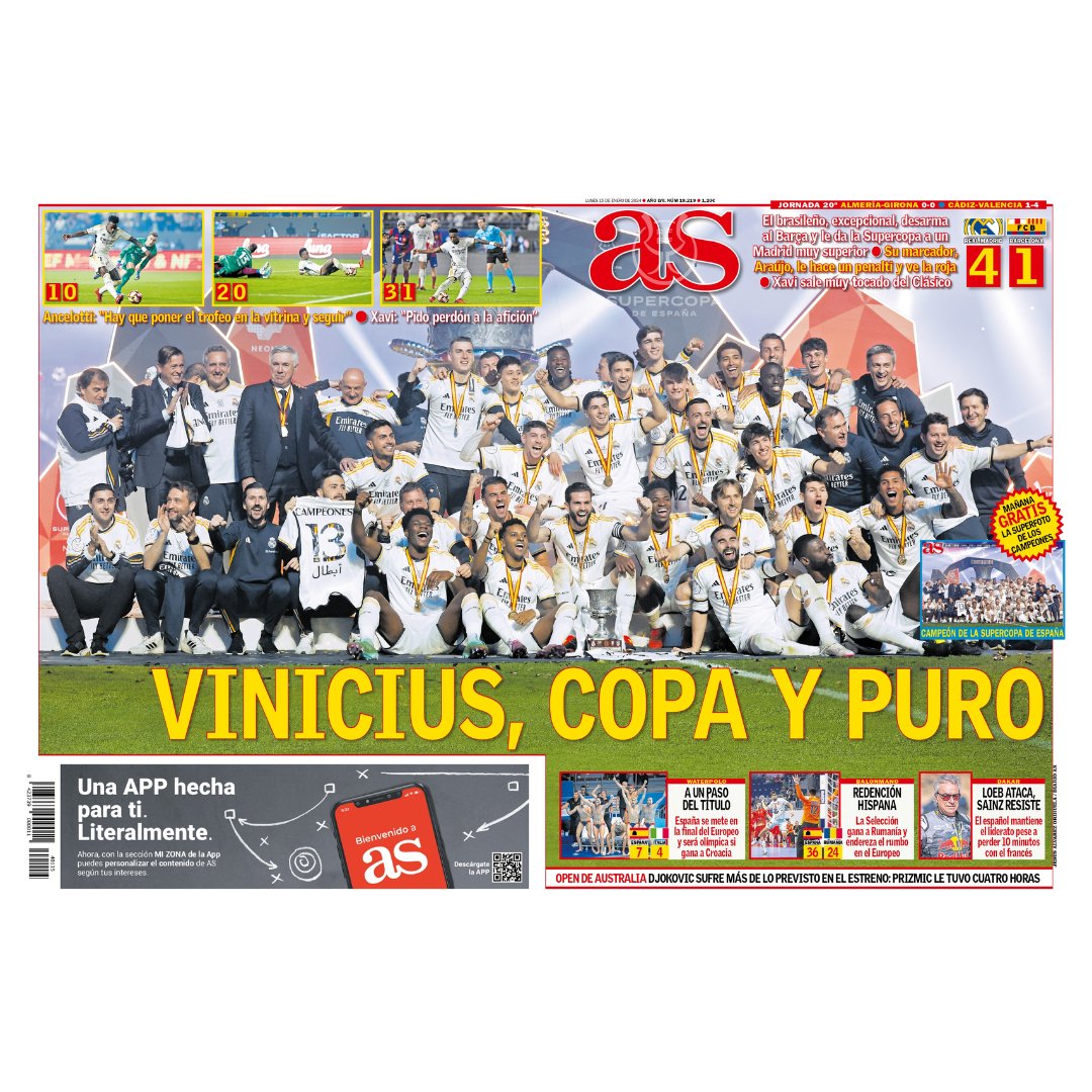 بينما قالت صحيفة اس الإسبانية في غلافها، فينيسيوس والكأس الذي فعله البرازيلي الاستثنائي، منح كأس السوبر لريال مدريد المتفوق كثيرًا وأراوخو المتواضع تسبب في ركلة جزاء وطرد.