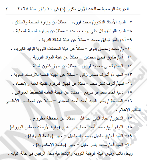 ونص قرار رئيس الوزراء بشأن اللجنة العليا للطوارئ النووية والإشعاعية: على أن يعاد تشكيل اللجنة العليا للطوارئ النووية والإشعاعية المنشأة بقرار رئيس مجلس الوزراء رقم 962 لسنة 2013 المشار إليه برئاسة الأستاذ الدكتور سامی شعبان عطا الله - رئيس هيئة الرقابة النووية والإشعاعية وعضوية كل من السادة: