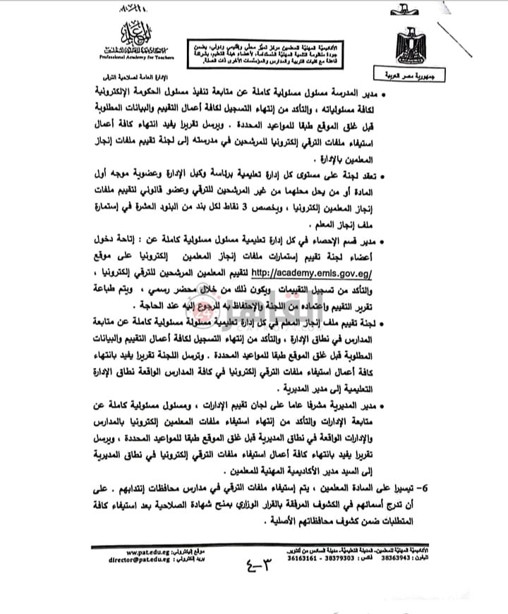 وقالت الأكاديمية المهنية للمعلمين في خطاب: في إطار تنظيم إجراءات الحصول على شهادة الصلاحية اللازمة للترقي إلى الوظائف الأعلى من وظائف المعلمين، وفي ضوء موافقة الدكتور الوزير رئيس مجلس إدارة الأكاديمية المهنية للمعلمين على آليات حوكمة ورقمنة عمليات الترقي، والاعتماد على نظام النقاط في تقييم مكونات ملف الترقي، واستيفاء ذلك إلكترونيا، تنفيذا لرؤية مصر 2030 في مجال التحول الرقمي.