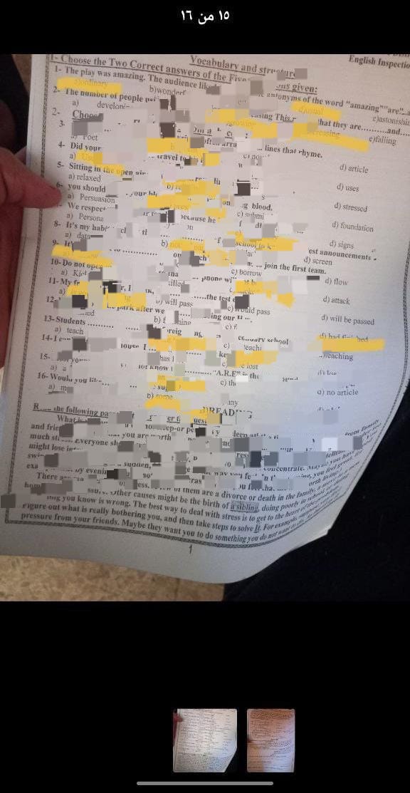 تتداول حاليًا جروبات الغش الإلكتروني عبر تطبيق تليجرام، عددًا من الصور، زاعمة أنها خاصة بامتحان اللغة الأجنبية الأولى الذي يؤديه طلاب الصف الأول الثانوي الدور الأول بمحافظة الجيزة، داخل اللجان الآن، حيث نشرت الصور بعد دخول الطلاب اللجان بنصف ساعة.