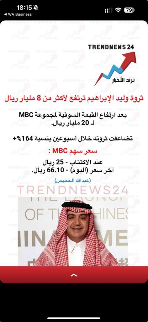 كما أعلنت صحيفة الموجز السعودي، ارتفاع ثروة رجل الأعمال السعودي وليد الإبراهيم مالك مجموعة MBC لأكثر من 8 مليارات ريال خلال أسبوعين، بعد إدراج المجموعة في سوق الأسهم، حيث سجلت ارتفاعا تاريخيا في القيمة السوقية لها لتصل 20 مليار ريال، لتتضاعف ثروته خلال هذه الفترة القصيرة بنسبة تجاوزت 160%.