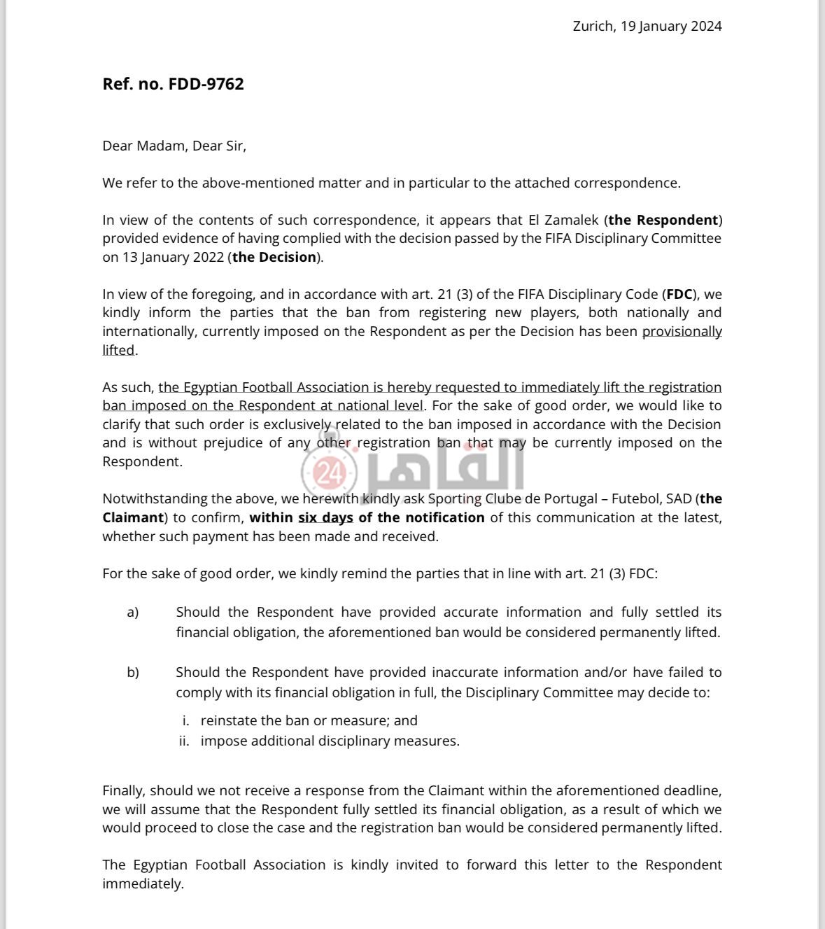 وأخطر فيفا الزمالك رسميا بإمكانية ضم لاعبين جدد إلى صفوفه بعد رفع عقوبة منع القيد، عقب تسوية النادي القضايا التي كانت مرفوعة عليه، وتسببت في منع القيد.